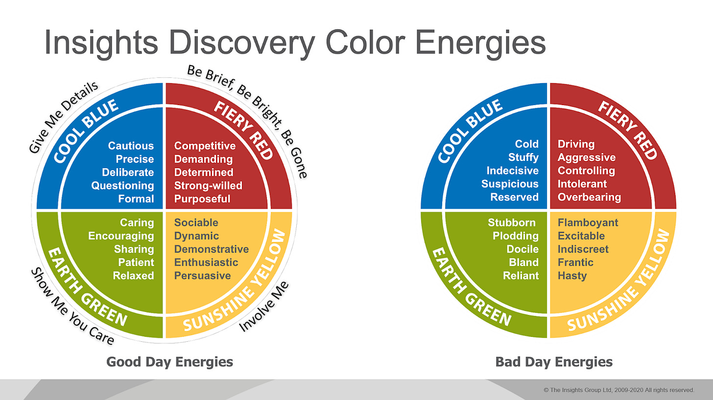 Let’s get back to Carl Jung. Insights Discovery uses Jungian principles to describe four distinct color energies that make up each of our personality and communication styles. While each of us has a combination of all four color energies, we will lead with one, or maybe two, depending on the situation.: